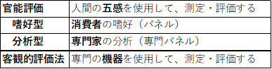 以上のように分けて考えると、食品の評価法について理解が深まると思います。