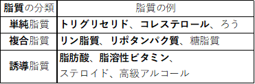 誘導脂質…脂肪酸、脂溶性ビタミン、ステロイド、高級アルコール