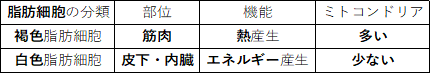 褐色脂肪細胞…部位:筋肉 機能:熱産生 ミトコンドリア:多い