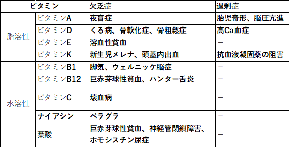 以上のように分けて考えると、ビタミン・ミネラルの欠乏症・過剰症について理解が深まると思います。