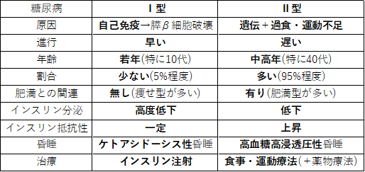 原因…Ⅰ型:自己免疫→膵β細胞破壊 Ⅱ型:遺伝+過食・運動不足