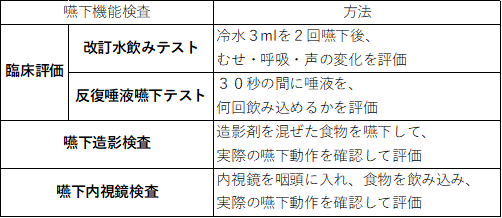 改訂水飲みテスト…冷水3mlを2回嚥下後、むせ・呼吸・声の変化を評価