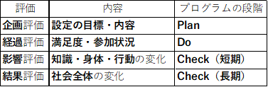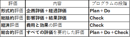 形式的評価…内容:企画評価+経過評価 プログラムの段階:Plan+Do
