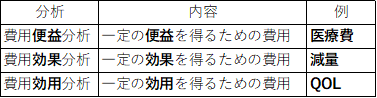 費用効用分析…内容:一定の効用を得るための費用 例:QOL