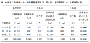 4 ある年の A 地域と B 地域における人口および死亡の状況を示した(表)。A 地域