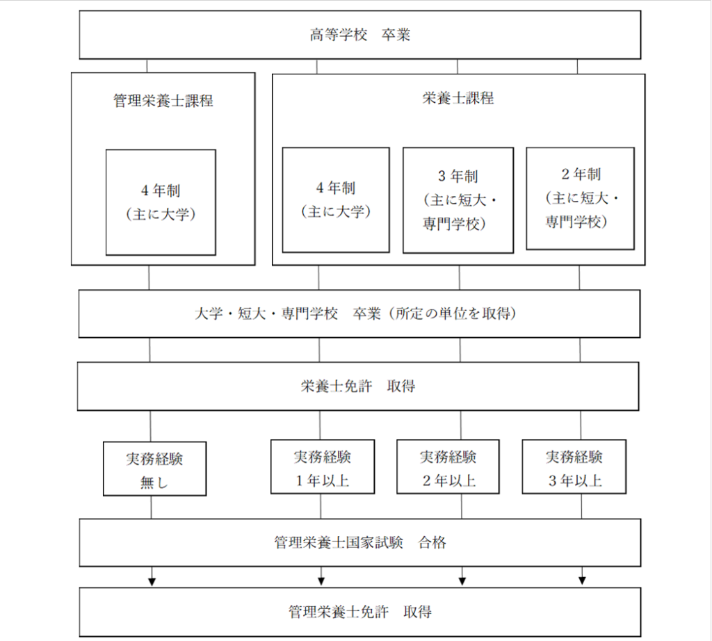 ①管理栄養士課程の、大学・専門学校(4年制)に通い、所定の単位(管理栄養士課程)を取得して卒業する。その後、管理栄養士国家試験に合格すると交付されます。(実務経験は不要)