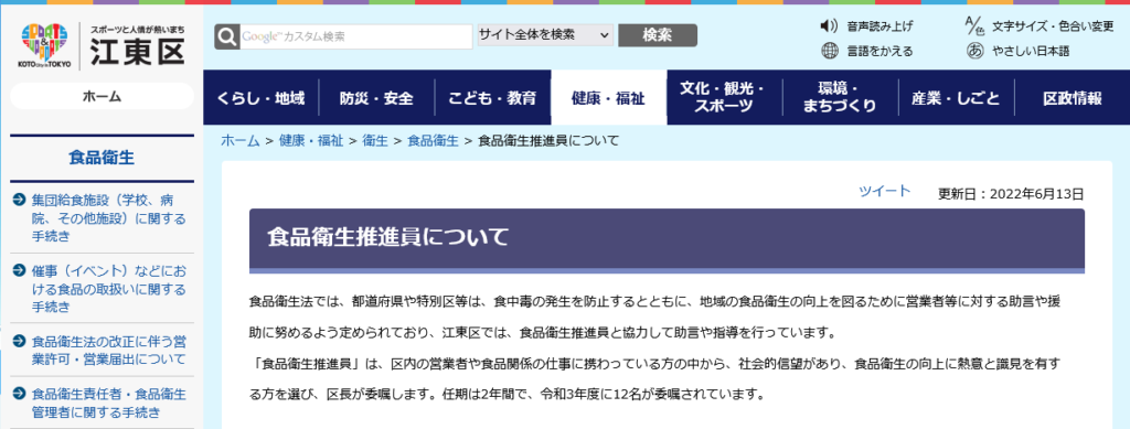 食品衛生推進員HP(江東区):https://www.city.koto.lg.jp/260404/fukushi/ese/shokuhin/suisin-in.html